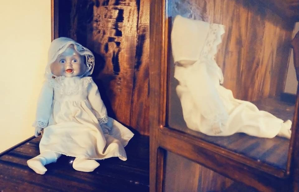 Dukken ligger ned, nej den er faktisk væltet. Der har ikke været noget i nærheden af det skab i timevis, og vil mene, at hvis det er fordi skabet er lidt ustabilt, så ville dukken glide ned, stille og roligt, og ligge sig på ryggen. Men det gjorde den ikke. Om det bare er et uheld, eller om den har prøvet, at rejse sig op, eller var det måske dukkens ejermand, der prøvede at tage den? Dukken plejer at sidde, sådan her som i kan se.